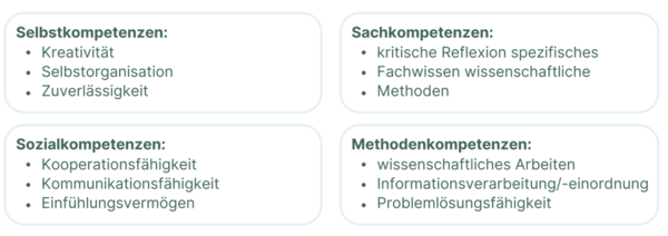Die Inhalte und Methoden des Projekts waren auf das Ziel zugeschnitten, dass sich die Studierenden innerhalb der vier Kompetenzbereiche in bis zu 12 Bereichen weiterentwickeln konnten. Diese bilden eine Grundlage für das weiterführende Studium sowie das spätere Berufsleben der Studierenden.