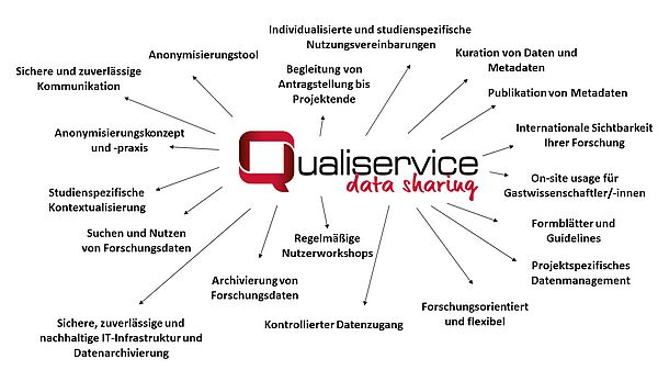 Qualiservice ist ein vom Rat für Sozial- und Wirtschaftsdaten (RatSWD) akkreditiertes Forschungsdatenzentrum und bisher das einzige Forschungsdatenzentrum in Deutschland, das qualitative sozialwissenschaftliche Forschungsdaten unabhängig von Disziplin und Thema archiviert und für wissenschaftliche Nachnutzungen in Forschung und Lehre bereitstellt. Das Portfolio erstreckt sich mittlerweile auf die gesamte Bandbreite qualitativer Forschungsdaten und -materialien, beispielsweise textbasierte Daten wie Interviewtranskripte, Beobachtungsprotokolle und Feldtagebücher, aber auch Mixed-Methods-Daten, Fotos, sowie audio-visuelle Daten. Dabei besteht die Expertise insbesondere in der Archivierung sensibler, das heißt in der Regel personenbezogener Forschungsdaten sowie den damit verbundenen ethischen, rechtlichen und technischen Voraussetzungen. Kennzeichnend für die Archivierung mit Qualiservice ist dabei, dass die Vorbereitung der Datenarchivierung als kooperative Aufgabe von Forschenden und Forschungsdatenzentrum verstanden wird.