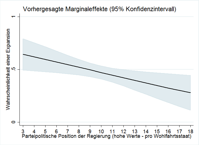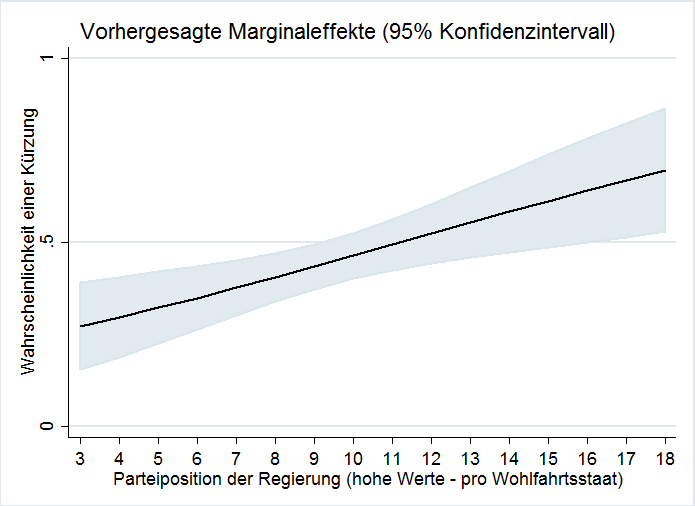 Besonders spannend ist freilich die Frage, welche Muster sich hinsichtlich der Regierungsbeteiligung von Union und SPD abzeichnen. Hier gibt der Fall Deutschland eine eindeutige Antwort: In unseren Regressionsanalysen (statistische Überprüfung theoretisch angenommener Zusammenhänge - Abbildungen 2) finden wir einen bedeutsamen parteipolitischen Effekt, wonach sozialstaatlicher Kürzungspolitik umso wahrscheinlicher ist, je wohlfahrtsstaats-freundlicher die ideologische Position der Regierung ausfällt.