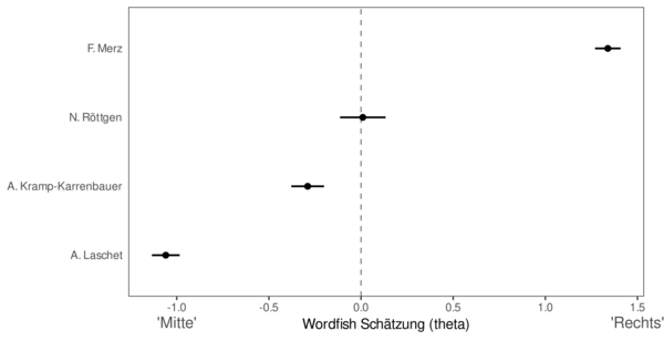 Doch inwieweit haben die drei Kandidaten um den Parteivorsitz überhaupt inhaltliche Differenzen öffentlich ausgetragen, welche einen negativen Effekt auf den zukünftigen Stimmenanteil der Partei hätten? Zur Beantwortung dieser Frage nutze ich eine quantitative Textanalyse (Wordfish), in der die inhaltlichen Positionen in den Bewerbungen der Kandidaten anhand der Häufigkeit genutzter Wörter differenziert werden. Die Anzahl der durch die Kandidaten genutzten Wörter wird mit einer statistisch erwarteten Nutzung verglichen. Kandidaten, die bestimmte Wörter überproportional häufig gebrauchen, werden unterschiedliche Positionen zugewiesen. Die Position der Kandidaten wird zudem auf einer Skala abgebildet, bei der die zwei Kandidaten mit dem unterschiedlichsten Wortgebrauch, und damit der anzunehmenden stärksten inhaltlichen Differenz, die Extreme bilden. Als Grundlage bedient sich diese Analyse der Bewerbungen der drei Kandidaten in den CDU Kandidatenprofilen und den politischen Programmen auf den persönlichen Internetauftritten von Armin Laschet, Friedrich Merz (inkl. Merzmail) und Norbert Röttgen (inkl. jetzt-voran.de). Zum Vergleich wurde außerdem die Bewerbungsrede von Annegret Kramp-Karrenbauer (AKK) auf dem 31. Bundesparteitag der CDU von 2019 hinzugezogen. Zur besseren Vergleichbarkeit wurden direkte Bezüge zu Covid-19 nicht berücksichtigt. Auf Grund der Vielzahl an Themenbereichen in den Bewerbungen der Kandidaten kann angenommen werden, dass das Ergebnis der Wordfish Analyse die wirtschaftspolitische Dimension 'Links-Rechts' grob widerspiegeln.