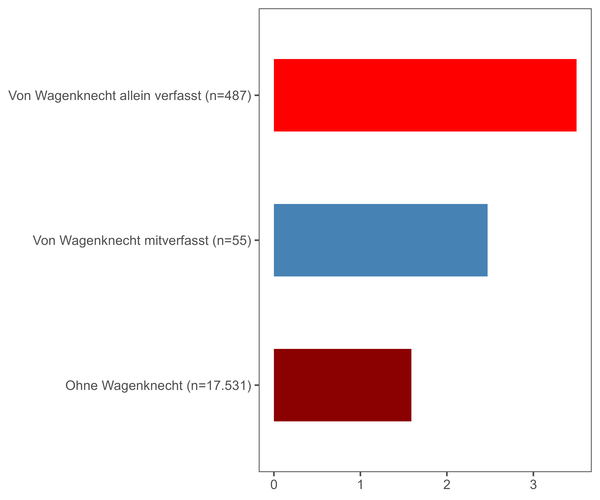 Bezüglich der Pressemitteilungen erlaubt die Analyse zu überprüfen, welchen Effekt die Autorenschaft von Sahra Wagenknecht hat. In Abbildung 2 ist gut zu erkennen, dass Pressemitteilungen, die Abgeordnete ohne sie verfasst haben, die wenigsten populistischen Kommunikationselemente aufweisen. Ihre Mitautorenschaft erhöht den Populismusgrad, doch der höchste Anteil populistischer Rhetorik ist in Pressemitteilungen zu finden, die von ihr allein verfasst worden sind.
