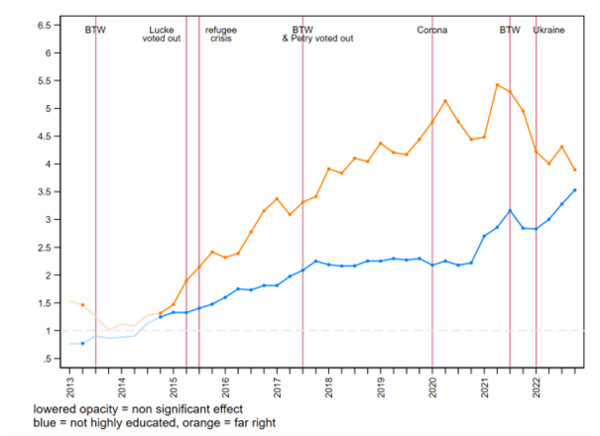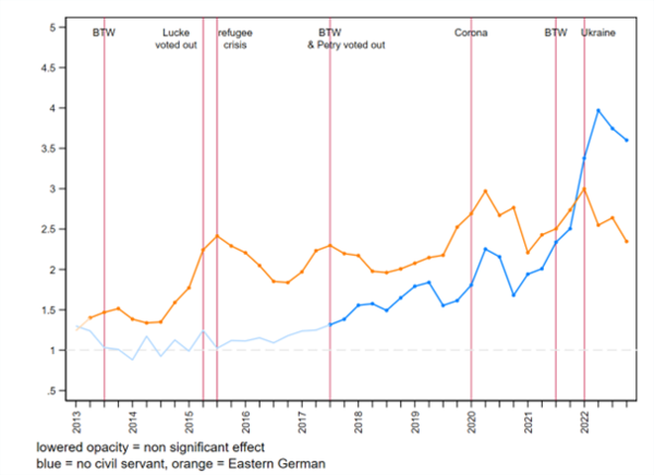 So konnten wir zeigen, dass sich die Wählerschaft der AfD mehr und mehr aus extrem rechts positionierten, niedrig bis mittel gebildeten sowie ostdeutschen Wählerinnen und Wählern zusammensetzt. Darüber hinaus hat sich im Zuge des Wandels der Partei eine stark immunisierende Wirkung eines Beamtenverhältnisses herausgebildet.