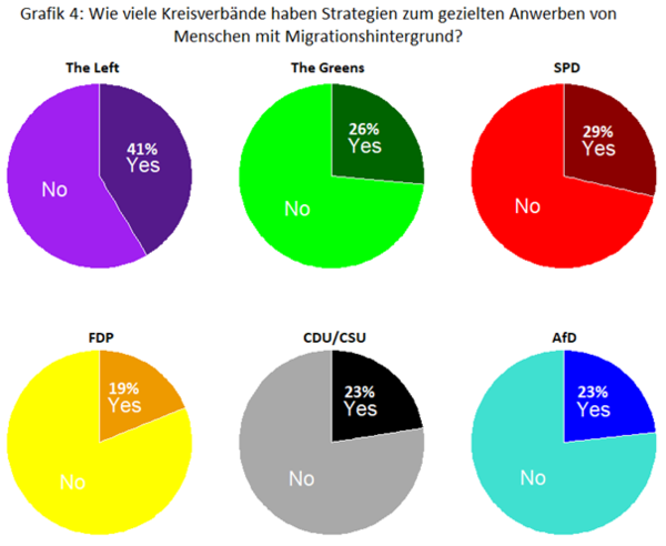 Schließlich wurden die Parteivertreter*innen gefragt, ob ihre Kreisverbände über Strategien zur Gewinnung von Menschen mit Migrationshintergrund verfügen. Abbildung 4 zeigt den Prozentsatz der Vertreter*innen, die diese Frage mit ja oder nein beantwortet haben. Wie man sieht, hatte die Linke den höchsten Anteil an Kreisverbänden mit Strategien zur Anwerbung von Migrant*innen (41 %), während die FDP mit 19 % den niedrigsten Anteil aufwies. Zu den am häufigsten genannten Strategien gehörten die Veröffentlichung mehrsprachiger Dokumente und die Zusammenarbeit mit lokalen Migrant*innenvereinigungen. Zu den weiteren Strategien, die genannt wurden, gehören eine erhöhte Sichtbarkeit von Migrant*innen in Spitzenpositionen, ein ausdrückliches Bekenntnis zu Vielfalt und die Einrichtung von Arbeitsgruppen zu Themen, die für Migrant*innen von Interesse sind.