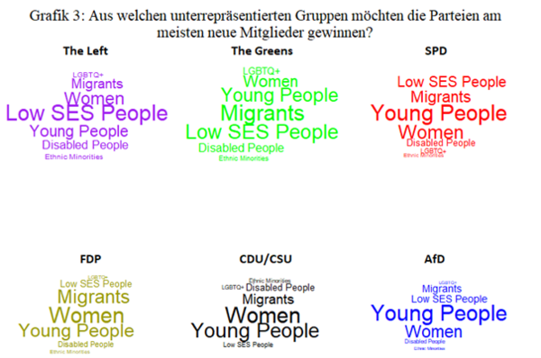 Auf die Frage, bei welchen derzeit unterrepräsentierten Gruppen die sechs Parteien den größten Bedarf für eine stärkere parteipolitische Einbindung sehen, zeigten sie unterschiedliche Prioritäten. Lediglich die Grünen nennen Migrant*innen als primäre Zielgruppe, während die SPD und die AfD auf junge Menschen, die Linke auf Menschen mit niedrigem sozioökonomischem Status und die FDP und die CDU/CSU auf Frauen setzen. Dies ist in Abbildung 3 dargestellt, in der größere und zentralere Begriffe in der Wordcloud häufiger genannte Zielgruppen darstellen.