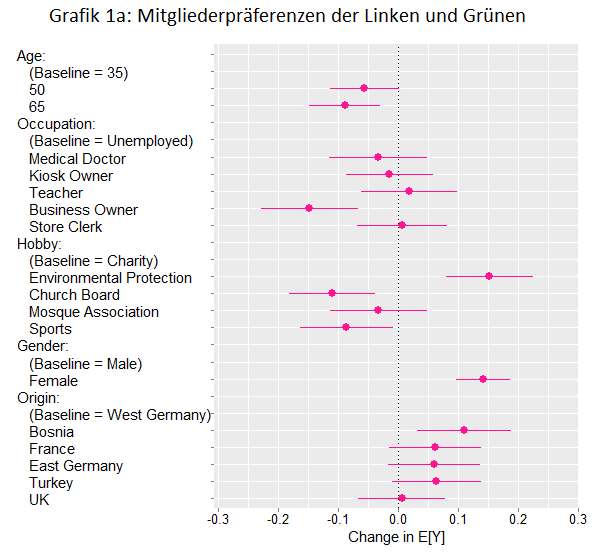 Abbildung 1a zeigt die Mitgliederpräferenzen der Parteivertreter*innen der Grünen und der Linken. Ein Beispiel: 65-Jährige werden als weniger bevorzugt angegeben als 35-Jährige. Darüber hinaus werden neue weibliche Mitglieder gegenüber neuen männliche Mitgliedern bevorzugt. Bei der für die Studie wichtigsten Dimension, den Herkunftsländern, zeigen beide Parteien eine Präferenz für Menschen mit Migrationshintergrund gegenüber gebürtigen Deutschen. Insbesondere Personen aus Bosnien werden als signifikant bevorzugt angegeben.