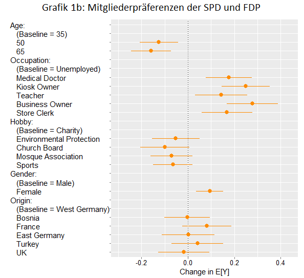 Bei der SPD und der FDP sehen die Mitgliederpräferenzen ähnlich aus, bis auf die Tatsache, dass sie keine eindeutigen Präferenzen für Menschen aus irgendeinem Herkunftsland zeigen, wie in Abbildung 1b zu sehen ist. Darüber hinaus haben diese beiden Parteien eine klare Abneigung gegenüber arbeitslosen Neuzugängen, da alle Berufskategorien signifikant positive Koeffizienten im Vergleich mit dem Ausgangswert einer arbeitslosen Person aufweisen.