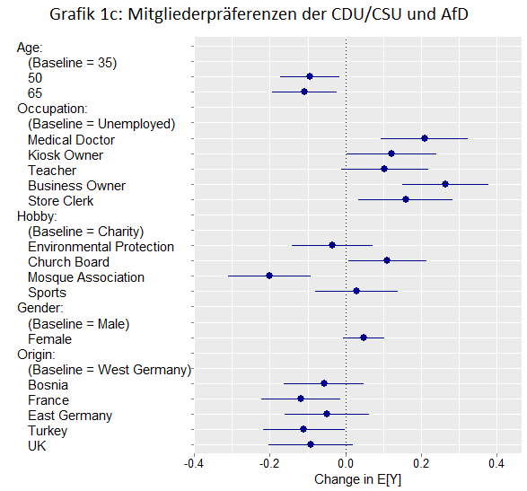 Die CDU/CSU und die AfD haben im Vergleich zu den Grünen und Linken eine umgekehrte Präferenz der Herkunftsländer: einheimische Deutsche werden gegenüber Personen mit Migrationshintergrund bevorzugt. Insbesondere Frankreich und die Türkei werden als deutlich weniger wünschenswerte Herkunftsländer angegeben. In diesem Zusammenhang wird auch das Engagement in einem Moscheeverein als das am wenigsten wünschenswerte Hobby für ein potenzielles neues Mitglied angegeben. Dies ist in Abbildung 1c dargestellt.
