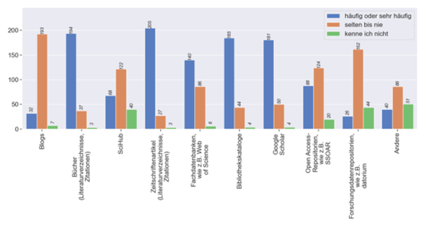 Das Rechercheverhalten hat sich gegenüber 2020 kaum verändert. Google-Scholar und Bibliothekskataloge sind weiterhin wichtige Ressourcen zum Auffinden von Quellen. Noch häufiger genutzt werden allerdings Literaturverzeichnisse und Zitationsangaben aus Zeitschriftenartikeln und Büchern (siehe Abb. 3). Diese Ressourcen wurden 2024 erstmalig abgefragt und können aus diesem Grund nicht mit den Ergebnissen von 2020 verglichen werden.