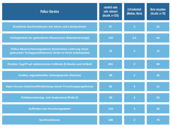 Für die Analyse der Zufriedenheit mit den Services von Pollux wurden die Variablen Relevanz und Zufriedenheit zusammengeführt und ausgewertet (siehe Abb. 4). Die Frage nach der Zufriedenheit wurde nur den Teilnehmenden angezeigt, die zuvor geantwortet hatten, Pollux zu nutzen (n=83). Die Frage nach der Relevanz der Services für den akademischen Alltag wurde allen 237 Teilnehmenden gestellt und von 235 Personen beantwortet.