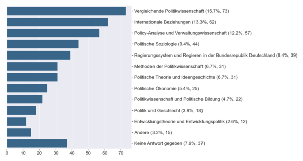 An der Umfrage haben insgesamt 237 Personen teilgenommen, davon 205 Politikwissenschaftler*innen aus allen Teilgebieten (siehe Abb. 2). Der Großteil der Teilnehmenden (TN) gab an, aktuell als wissenschaftliche*r Mitarbeiter*in (115 TN) tätig zu sein, gefolgt von 45 Professor*innen, 12 studentischen Hilfskräften und 7 Juniorprofessor*innen.