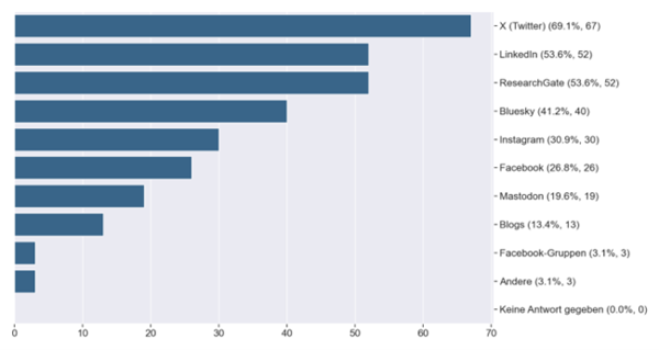 Bemerkenswert, wenn auch wenig überraschend, ist die Verschiebung bei der Nutzung verschiedener Plattformen: Die Nutzung von X (ehemals Twitter) sank von 79,8% im Jahr 2020 auf 69%, während Bluesky inzwischen von 41,2% genutzt wird. LinkedIn verzeichnete einen deutlichen Anstieg von 29,8% im Jahr 2020 auf 53,6%. Die offene Plattform Mastodon (siehe hierzu den Blogbeitrag „Mastodon im Fediverse: Eine offene Alternative für die Wissenschaftskommunikation“, ) wird immerhin von knapp 20% der Teilnehmenden zur Wissenschaftskommunikation genutzt (siehe Abb. 5).