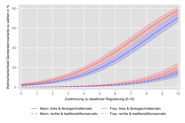 Die weitere statistische Analyse zeigt, dass die Bereitschaft, die Variante mit Genderstern zu lesen, eng mit politischen Einstellungsmustern zusammenhängt: Personen, die generell eher staatlichen Eingriffen zustimmen, wählen diese häufiger, genauso wie eher linke und eher ökologisch-alternativ ausgerichtete Menschen. Abbildung 3 präsentiert getrennt für Männer und Frauen die anhand des Regressionsmodells vorhergesagten Wahrscheinlichkeiten, die Variante mit Genderstern zu wählen für zwei sich in ihren politischen Einstellungen maximal unterscheidende Gruppen: erstens Personen, die sich ganz links und ganz alternativ-ökologisch sehen und zweitens solche am gegenüberliegenden Ende des politischen Spektrums, nämlich ganz rechts und ganz traditionell/konservativ. Während auch sehr links-ökologisch-alternative Personen, sofern sie staatliche Eingriffe ablehnen, so gut wie nie die Variante mit Genderstern wählen würden, erhöht sich deren Wahrscheinlichkeit, die geschlechtergerechte Version des Fragebogens anzuklicken, auf 70 % für Männer und 75 % für Frauen, sofern sie eine maximale Zustimmung zu staatlichen Eingriffen aufweisen.