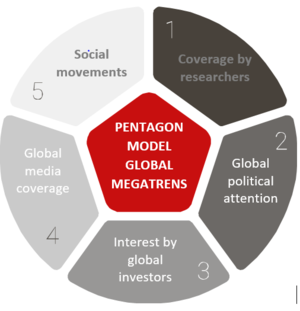 Die Auseinandersetzung mit Zukunftstrends steht in engem Zusammenhang mit globalen Risiken. Den Zusammenhang zwischen Risiken und Trends hat z.B. das World Economic Forum (WEF) in seinen Jahresberichten (World Risk Reports) zu „global shapers“ herausgearbeitet. In den ersten Sitzungen wurde eine Definition von Megatrends erarbeitet, die sich an dem von mir vorgestellten Pentagon Modell orientiert.
