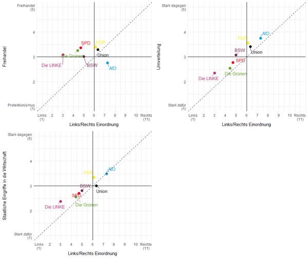 Bei Umverteilung und staatlichen Eingriffen in die Wirtschaft zeigt sich ein recht lineares Bild. Hier ordnen sich die Wähler*innen relativ konsistent zu ihrer allgemeinen links/rechts Verortung ein. Wähler*innen des BSW vertreten in beiden Fällen im Durchschnitt ökonomisch rechtere Positionen als die von SPD und Grünen. Diese Selbsteinordnung weicht von der GEPARTEE-Einordnung der Parteiposition ab, die das BSW in diesen Themen als ökonomisch linker klassifiziert.