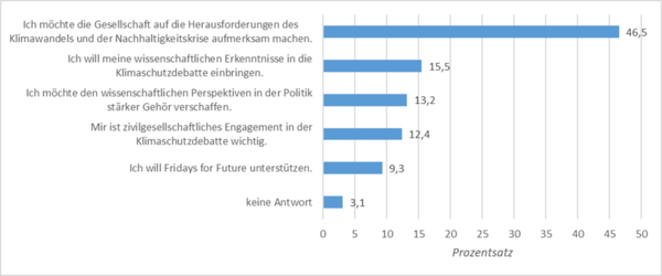 Auch die Rolle von wissenschaftlicher Expertise wird von den Teilnehmer*innen der Umfrage unterschiedlich bewertet. Insgesamt strebt die Mehrheit der befragten S4F, angesichts der Dringlichkeit der Klimakrise, nach einem grundlegenden Bewusstseinswandel und wünscht sich eine sehr viel stärkere Rolle wissenschaftlicher Erkenntnisse in der öffentlichen Debatte und in politischen Entscheidungsprozessen. Dies sind gleichzeitig zentrale Motivationen der Aktivist*innen für ihr Engagement; das Gründungsmotiv, die FfF wissenschaftlich zu flankieren, ist dabei inzwischen in den Hintergrund gerückt (s. Abb. 2).