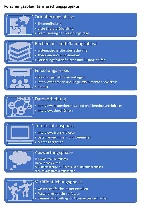Das Lehrforschungsprojekt wurde wöchentlich und dreistündig abgehalten, wobei sich der in-class-Unterricht nach den jeweiligen Arbeitsphasen der Studierenden unterschied (s. Abbildung 1). Der Beginn der Lehrforschung wurde durch den Input der Dozierenden geprägt, bezüglich des thematischen Rahmens, der Methoden- und Theorieauswahl, dem Feldzugang, der Erstellung von Leitfragen für semi-strukturierte Interviews, dem Abfassen von Interviewnotizen, der Transkription und der Datenauswertung. Hierbei wurden die Studierenden an die Transkriptionssoftware f4 und die Auswertungssoftware MaxQDA herangeführt. Bei der Wissensvermittlung wurde auf Vielseitigkeit gesetzt, d.h. es wurden wissenschaftliche wie nicht-wissenschaftliche Quellen herangezogen und digitale Lernformate und -videos eingesetzt. Parallel zu der inhaltlichen Vermittlung fand die Forschungsgruppen- und Themenfindung statt. Im Kursverlauf haben die Studierenden mehr Raum erhalten, ihre Forschungsprojekte vorzubereiten, zu planen und diese umzusetzen, sodass im Januar ein offenes Kursangebot bestand. D.h. der Kurs wurde in Form eines offenen Sprechstundenformats abgehalten und die Studierenden wurden verstärkt in ihren aktuellen Forschungsprozessen angepasst an ihren Arbeitsfortschritt beraten und Fragen detailliert beantwortet. Zum Ende der Vorlesungszeit sind alle Studierenden im Plenum erneut zusammengekommen und haben ihre Forschungsergebnisse präsentiert. Die Ergebnisse wurden mittels selbst angefertigter wissenschaftlicher Poster präsentiert, fachlich kommentiert und in individuellen Forschungsberichten schriftlich dokumentiert.