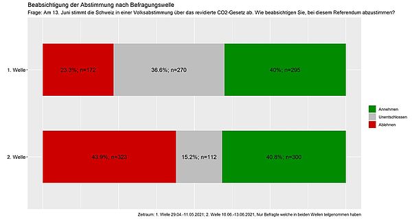 In der Schweiz wurde das in diesem Jahr exemplarisch und sehr plakativ bei der Abstimmung zum CO2-Gesetz gezeigt. Das in Umfragen vor dem Start der Hauptkampagne jeweils relativ klare «JA» zum CO2-Gesetz (das u.a. auch eine Erhöhung der schweizerischen CO2-Abgabe beinhaltete) wurde durch die Nein-Kampagne der populistischen SVP und u.a. der Erdölkonzerne in den letzten Wochen vor dem Volksentscheid noch gekippt und schließlich wurde das progressive Klimapakets an der Urne abgelehnt. Die untenstehende Grafik zeigt die Verschiebung anhand einer von unserer Forschungsgruppe an der Universität Luzern durchgeführten repräsentativen Panel-Befragung zur Stimmabsicht beim CO2-Gesetz sehr deutlich. Wir haben Ende April und nochmals Anfang Juni 2021 (in den Tagen vor der Abstimmung) dieselben Leute befragt. Man sieht klar, dass es den Befürworter*innen des Gesetzes während der Hauptkampagnenphase kaum gelungen ist unentschlossene Stimmbürger*innen zu überzeugen, während es andererseits zu einem großen Zuwachs des «Nein»-Lagers durch die Kampagne kam.