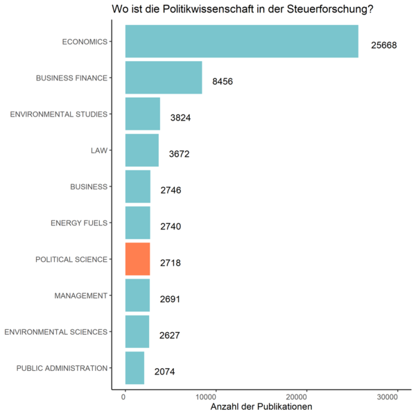 Doch noch vergeben wir als Fach diese Chance. Aus Abb. 1 geht hervor, dass die Ökonomie mehr Artikel zu Steuern veröffentlicht hat als alle anderen Fachbereiche zusammen. Die Politikwissenschaft liegt in dieser Übersicht lediglich auf dem siebten Rang. Schaut man auf die Wohlfahrtstaatsforschung ergibt sich ein genau gegenteiliges Bild. Hier hat unser Fach dreimal so viele Beiträge wie zur Besteuerung und doppelt so viele Artikel wie die Ökonomie produziert. Die Politikwissenschaft interessiert sich offensichtlich sehr viel mehr für die Ausgaben– als für die Einnahmenseite der Staatsfinanzen. Dabei kann die Einnahmenseite eine ähnlich umverteilende und regulierende Wirkung entfalten.