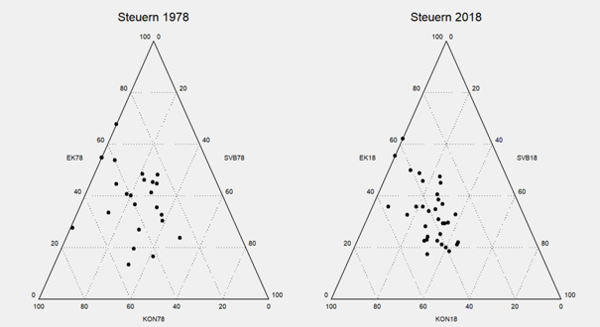 In unserem Beitrag sehen wir uns empirisch v.a. die relative Bedeutung der drei größten Steuer- und Abgabenformen an: direkte Einkommensteuern, Lohnsteuern (einschl. Sozialversicherungsbeiträgen) und Verbrauchssteuern (v.a. Mehrwertsteuern). Die Triplots (siehe Grafik) zeigen die relative Gewichtung der drei großen Steuerformen für die Jahre 1978 und 2018. Die Punkte stehen jeweils für einzelne Industrieländer. Die drei Achsen repräsentieren Einkommensteuern („EK78“ bzw. „EK18“), Lohnsteuern und Sozialversicherungsbeiträge („SVB78“ und „SVB18“) und Verbrauchsteuern („KON78“ und „KON18“). Zunächst fällt eine gewisse Konvergenz unter OECD Ländern auf – die Punkte in der rechten Teilgrafik liegen näher beieinander. Der Vergleich zwischen der linken und der rechten Grafik zeigt auch, dass der Steuer-Mix mit der Zeit weg von Einkommensteuern und zu den anderen beiden Steuerformen geht – die Punkte liegen etwas näher an der linken unteren Ecke.