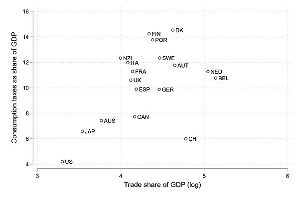 Abbildung 2 illustriert diesen Zusammenhang wiederum graphisch: Je stärker die Exportorientierung eines Landes, desto höher im Durchschnitt auch die Konsumbesteuerung. So belasten die skandinavischen Länder den Konsum traditionell sehr stark, während die USA und Japan traditionell eine sehr niedrige Konsumbesteuerung haben. Die Ausnahme ist in diesem Fall die Schweiz, die stark exportorientiert ist, wo der Mehrwertsteuersatz aber gerade einmal bei 7,7% liegt.