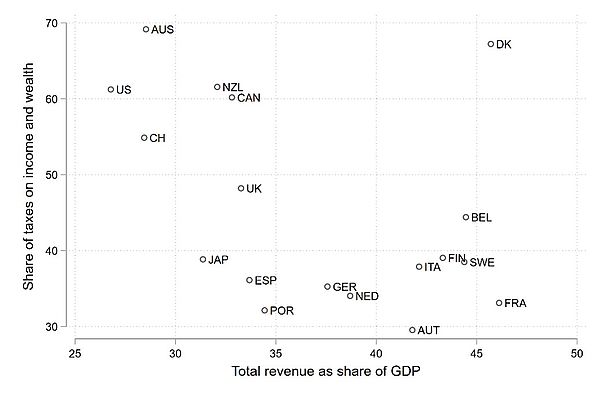 Blickt man zunächst genauer auf die verteilungspolitischen Ziele, dann zeigt sich, dass die Länder, die ein besonders progressives Steuersystem haben, also vor allem die oberen Einkommensschichten belasten, in der Regel relativ geringe Steuereinnahmen erzielen. Besonders hoch sind die Steuereinnahmen als Anteil am Bruttoinlandsprodukt dagegen in den Ländern, die auch die Mittelschicht stark heranziehen. Abbildung 1 illustriert dies anhand des Anteils der Steuern auf Einkommen und Vermögen – typischerweise die progressivsten Bestandteile eines Steuersystems – am gesamten Steueraufkommen: In den Ländern, in denen dieser Anteil besonders hoch ist, insbesondere in Australien und den USA; aber auch in der Schweiz, sind die gesamten Steuereinnahmen besonders niedrig. Die große Ausnahme ist hier Dänemark, das über die Einkommensteuer ein sehr hohes Steueraufkommen erzielt.