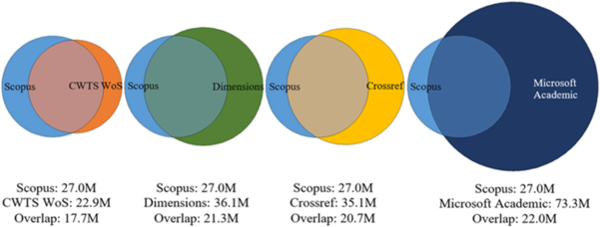 Visser, M., Van Eck, N. J., & Waltman, L. (2021). Large-scale comparison of bibliographic data sources: Scopus, Web of Science, Dimensions, Crossref, and Microsoft Academic. Quantitative Science Studies, 2(1), 20–41.