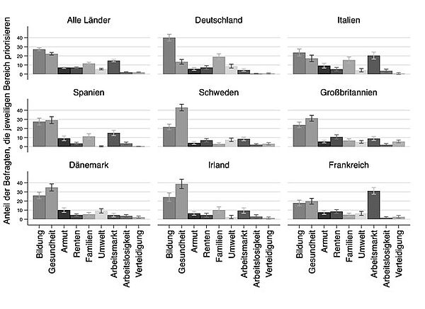 Ein erstes wichtiges Ergebnis: Bildung bleibt ein extrem populäres Thema, selbst wenn es in Zielkonflikten mit anderen Themen steht. Unsere Umfrage hat z.B. erhoben, für welchen Bereich die Befragten mehr Geld ausgeben würden, wenn sie sich für nur einen entscheiden müssten. Abbildung 1 zeigt die Ergebnisse. Wir sehen, dass Bildung in allen Ländern einen hohen Stellenwert einnimmt. Nur der Gesundheitsbereich wird in manchen Ländern noch häufiger priorisiert – und in Frankreich der Arbeitsmarkt.