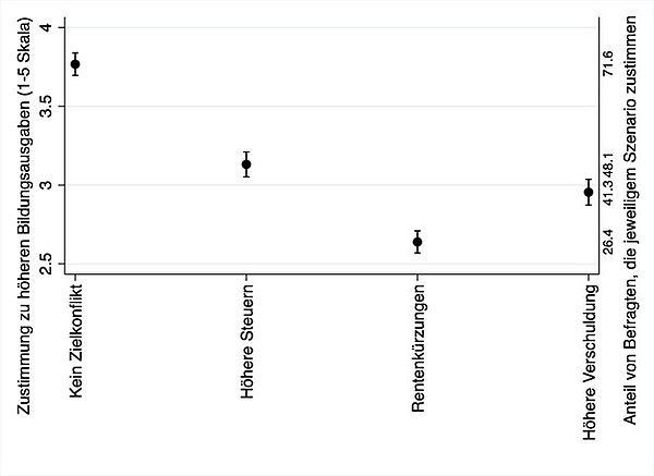 Ein zweites wichtiges Ergebnis: Bildung bleibt zwar populär, wenn die Kosten sichtbarer werden – aber die Zustimmungswerte sinken. Abbildung 2 zeigt das in Kürze mit Ergebnissen aus einem Umfrageexperiment: 72 Prozent der Befragten sprechen sich generell für höhere Bildungsausgaben aus. Erwähnt man jedoch, dass dies durch höhere Steuern finanziert werden könnte, sinkt die Zustimmung auf 48 Prozent; noch unbeliebter wäre eine Finanzierung durch staatliche Neuverschuldung (41 Prozent). Was die Befragten aber am stärksten ablehnen, wäre eine Kürzung bestehender Sozialleistungen, um mehr für Bildung ausgeben zu können. In Abbildung 2 zeigen wir dies am Beispiel der Renten (25 Prozent würden zustimmen, Bildungsausgaben auf Kosten der Renten zu erhöhen).