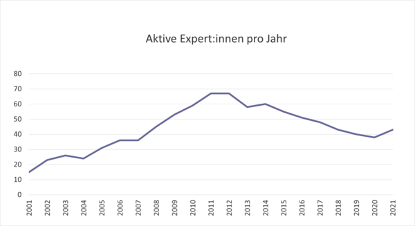 Die Aufmerksamkeit für Afghanistan unter Expert*innen hing oft von politischen Entwicklungen in Deutschland ab, nicht von Ereignissen in Afghanistan selbst. Ein Beispiel: Die Zahl der Expert*innen steigt nicht während der afghanischen Präsidentschaftswahlen (2004), sondern 2011, als das deutsche Mandat intensiv diskutiert wurde (siehe Abbildung 4).